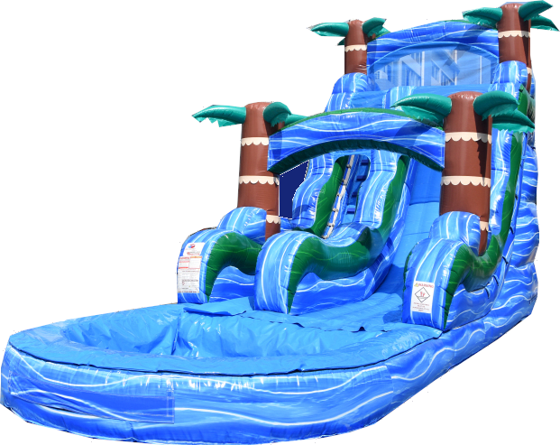 The Blue Bomb Bay is the crowd favorite, it is one of the most requested water slides in out inventory, if you like it go ahead and book it before someone else does. Maybe it's enchanting blue and grey marble color scheme with tropical palm tree's, we aren't sure but who are we to question the customer! Enjoy your hot summer day event with a large inflatable water slide. Don't forget to include one of our awesome Concession Machine add-ons!